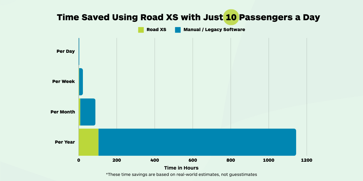 Many Dial-a-Ride and DRT services still rely on manual processes for route planning, bookings, and scheduling changes. On average, operators spend 1-2 hours per day on these tasks (booking just 10 passengers on each day). By automating these processes, Road XS saves 10 hours per week or 520 hours per year.